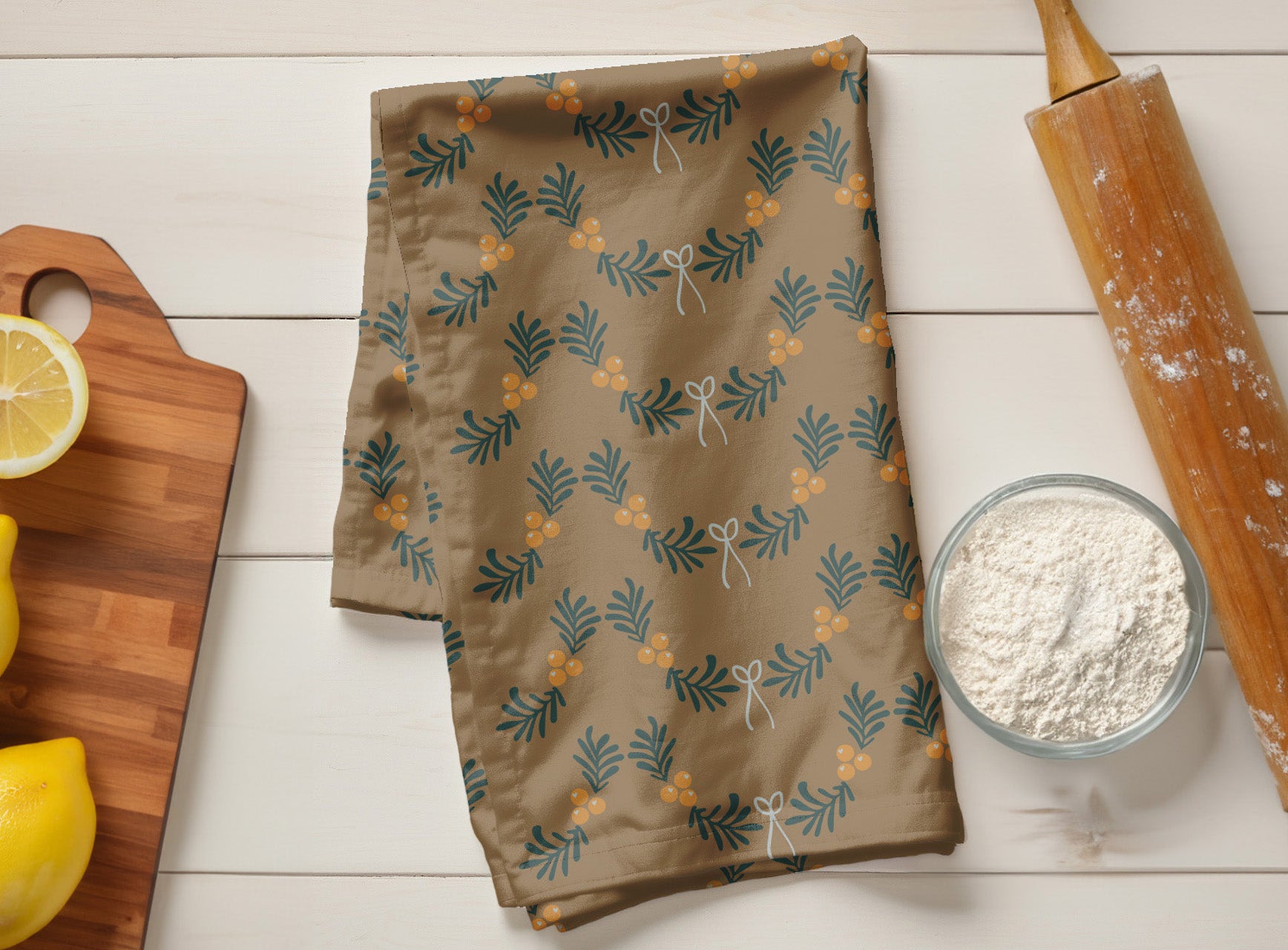 Add style and functionality to your kitchen with a high-quality tea towel featuring 432’s holiday garland with a darker background. These oversized towels, 27" x 27", offer durability and practicality, making them a versatile addition to your home or a thoughtful gift.