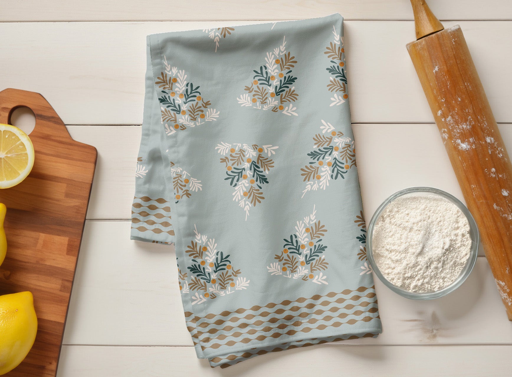 Add style and functionality to your kitchen with a high-quality tea towel featuring 432’s holiday trees in blue design. These oversized towels, 27" x 27", offer durability and practicality, making them a versatile addition to your home or a thoughtful gift.
