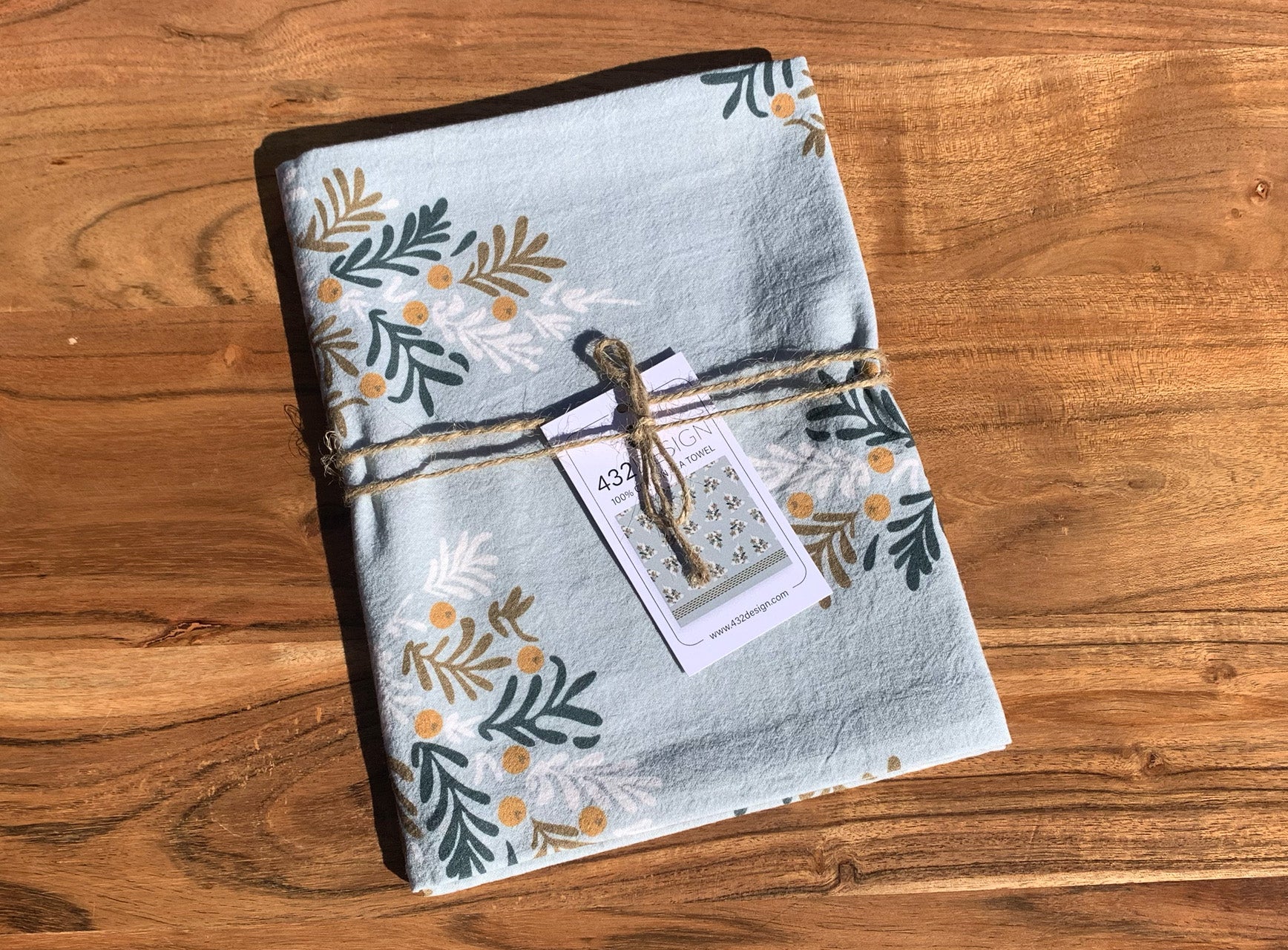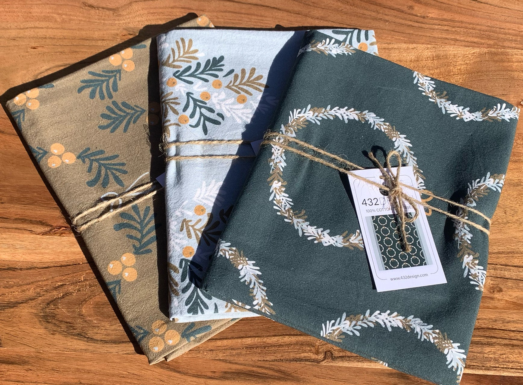 Give the gift this holiday of style and functionality with a high-quality tea towel featuring 432’s holiday trees in blue design. These oversized towels, 27" x 27", offer durability and practicality, making them a versatile addition to your home or a thoughtful gift.