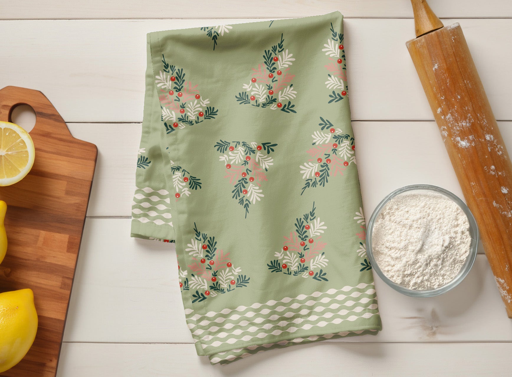 Add style and functionality to your kitchen with a high-quality tea towel featuring 432’s holiday trees in green design. These oversized towels, 27" x 27", offer durability and practicality, making them a versatile addition to your home or a thoughtful gift.